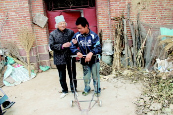 孩子大了总不能老呆在家里不出门,孙学英央求别人帮忙焊了一辆自己设计的三角支架车。有了这辆车,王庆志就能站立行走了。看到孙子扶着支架车走出院子,孙学英笑了。