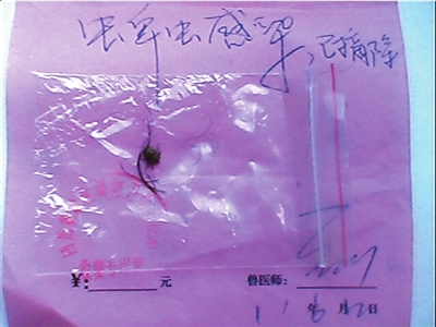 小区居民陆先生的宠物狗也被同样的小虫子三次叮咬。陆先生说,5月29日,他到小区草坪遛狗,回家给宠物狗洗澡时,发现小狗耳朵里有一个血块,而且血块里有好几条腿。陆先生强行将小虫子从小狗身上取了下来。6月8日,又发生了一次类似的事情。前天,又一只疑似蜱虫叮咬了宠物狗,陆先生将狗抱到回龙观防疫站,由工作人员将宠物狗身上的小虫取出。陆先生出示的诊断书显示“蜱虫感染,已摘除”。