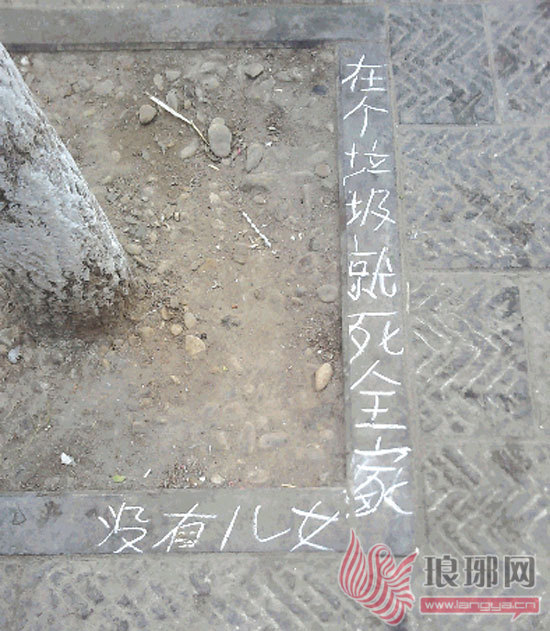 “门前的路沿石上被环卫工人用粉笔和炭灰写满了骂人的话,一个星期就写了3次。原来是用粉笔写上去的,前两天下雨字冲洗没了,现在又重新用炭灰写上去了。我们也找环卫部门反映过,可骂人的脏字依然出现在路沿石上。”6月12日,在市区启阳美食街开店的王女士致电本报新闻热线,讲述了她最近的烦心事。