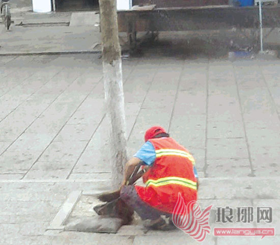 环卫工蹲在地上,居民说是在写字。而环卫工说,自己不识字。