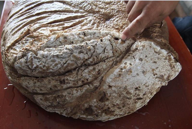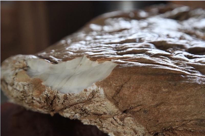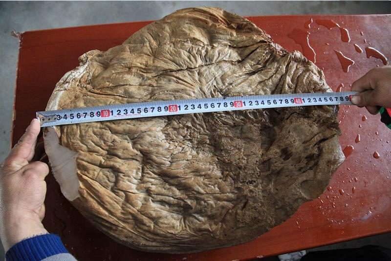 7日上午,记者来到石运佳的家中,见到了他手中的这块“宝贝”。从外观上看,呈现米黄色,通过周围的切口可以发现,其内部为乳白色;通过测量得出,其长约47厘米,宽约40厘米,重约25斤。用手摸起来,感觉比较柔软,有点像橡胶的感觉;用鼻子闻,也没有特殊的味道。