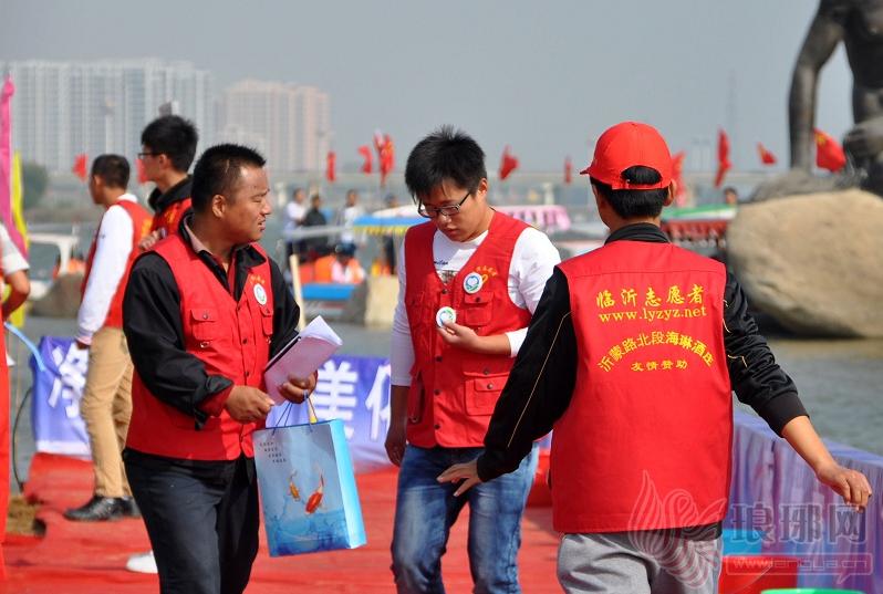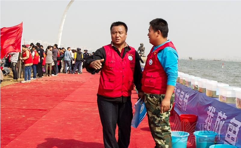 王金龙在沂河放鱼节现场从事志愿服务工作