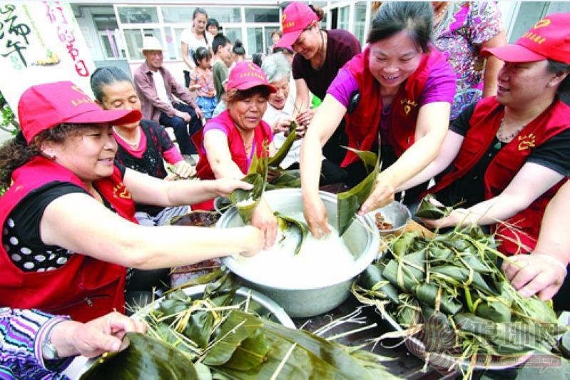 志愿者在兰山街道曹王庄社区敬老院与老人一起包粽子 资料照片
