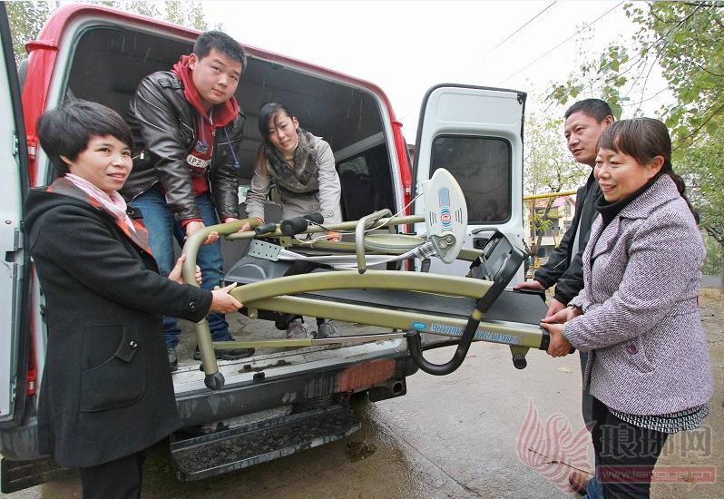 市民义捐的跑步机等康复器械运到,这让张烨(右一)欣喜不已