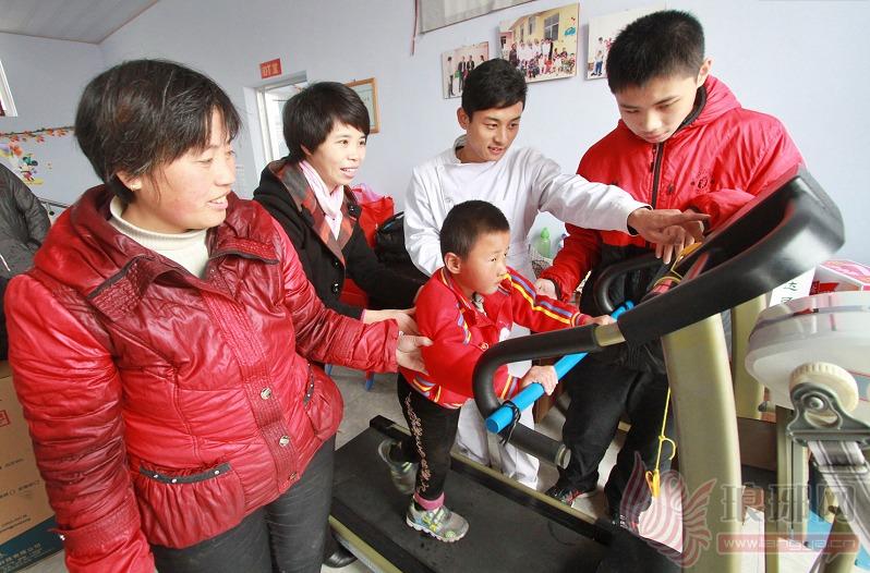 爱心少年王帅捷(右一)将自己义捐的跑步机稍加改造,便成了脑瘫患儿联系迈步的好工具