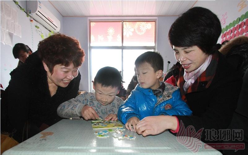 拼图游戏中,爱心市民和儿童与“星星的孩子”(左二)共同完成拼图