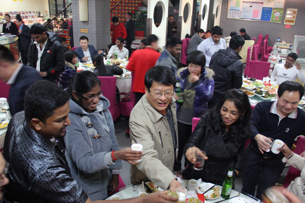 临沂网讯 11月13日,是印度的重大节日——“排灯节”。这天,临沂市拓普网络有限公司特地为印度籍专家40余人放假一天,并在“天天过年”为他们准备了丰盛的晚宴,中印员工欢聚一堂,共同庆祝印度“排灯节”。公司总经理王岚保和副总经理张金刚也特地赶到现场,为印度籍专家们祝贺节日快乐。现场气氛热烈融洽,每个人脸上洋溢着灿烂幸福的笑容。