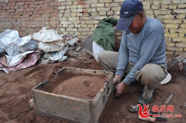 “俺使用的是南京六合区的红砂土,这种土壤耐高温,温度越高硬度越大,不像本地的土,炭火一烧就粉了,很难成为器皿。”高树文说着,找出一个平底锅模具涂上一层银粉,再筛满细细的红砂土,反扣在砂箱里,然后合上箱体,接着在倒扣的砂锅上方竖起一根木制浇口,先筛细砂土覆盖,再用粗砂土掩埋,最后用锤子把红砂土夯得结结实实,与箱体一起粘连成了箱盖。这样“倒铝锅”中的第二道打箱工序就完成了。