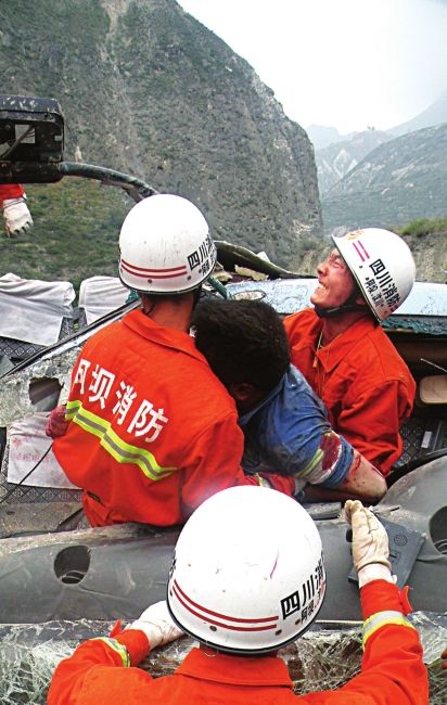 因为旁边就有一个做木材加工的工地,消防队员用木板把伤者和遇难者的遗体抬到了公路上,等待120的救援。很快,所有伤员被120急救车送往汶川县人民医院。同时,汶川县交警、安检、民政也前往现场参加救援。
