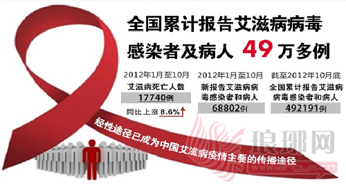 当前,性传播已经成为艾滋病的主要传播途径,男男同性性传播比例上升明显。今年1-10月新报告艾滋病病毒感染者中经性途径传播所占比例为84.9%,其中男男同性性传播所占比例为21.1%(2011年同期为15%)。今年监测发现,男男同性性行为人群艾滋病病毒感染率为6.7%。