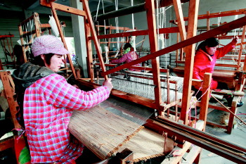 重坊镇琅琊草墙合作社的李成威说,“织女”们在用老式织布机织琅琊草墙布,订单来自深圳的一家出口企业。琅琊草在郯城一带称黄草,它不仅是人们的日常生活用品,又是一种精美的工艺品,一向畅销国际市场,是郯城重要出口创汇产品。琅琊草墙布采用老式织机织,原因是琅琊草在现代电动机械织机上几乎不能用,而老式木织布机是纯手工操作,节奏快慢宜于控制。