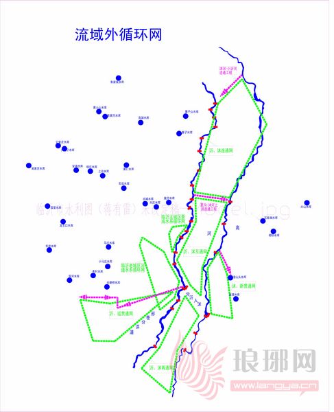 临沂主城区景观水系循环网,茶山拦河闸上引水进入柳青河和南坊新区景观河道,循环后重新汇入沂河。临沂老城区河道水系循环网和临沂主城区景观水系循环网为构建临沂市城区河道防洪、排水、景观、生态、用水等要求组成循环网。