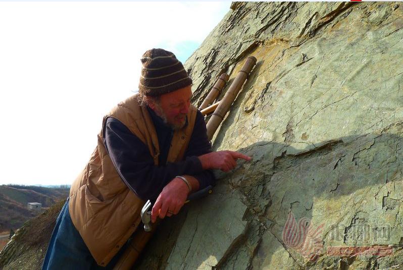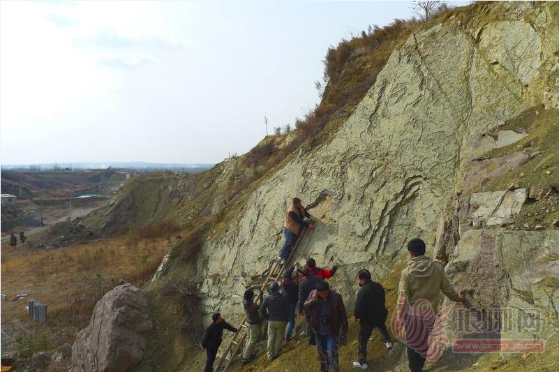 著名古生物专家、美国科罗拉多大学恐龙足迹博物馆馆长马丁·洛克利在岌山省级地质公园内考察鉴定“驰龙”足迹化石
