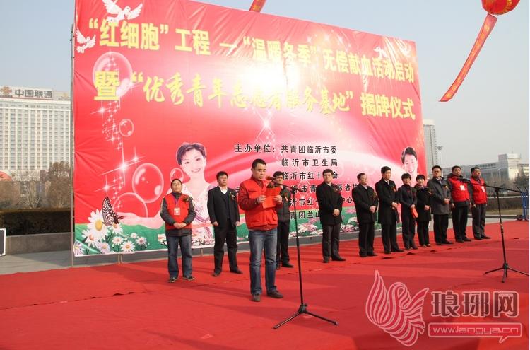 琅琊网12月5日讯(记者 王众 通讯员 徐大德)2012年12月5日,在国际志愿者日到来之际,临沂市“红细胞工程”——“温暖冬季”无偿献血活动启动暨“优秀青年志愿者服务基地”揭牌仪式在临沂市人民广场隆重举行,400多名青年志愿者参加启动仪式。