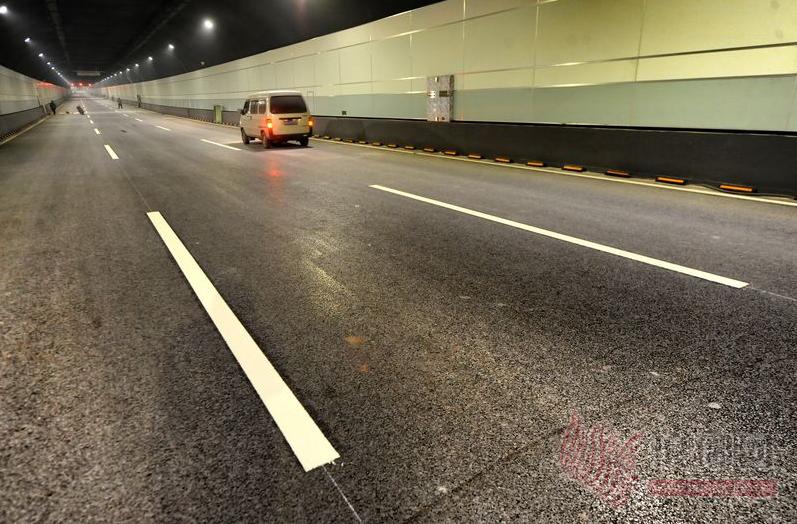 与10天前记者第一次进入隧道时不同,隧道内部已不再是黑漆漆的一片,全程开启的照明灯光射在新铺设的沥青路面上,映出富有质感的油光。路面上已施划的道路交通标线,在灯光下更是清新醒目,为车辆通行提供了保障。随着标线延伸的方向望去,隧道每隔几百米处,顶部都有一排绿色的通行指示灯,提示着车辆的通行方向。指示灯后则安装有巨大的射流风机,通过这种机器,可以一边往隧道内输送新鲜空气,一边把隧道内的汽车尾气排至洞外,这样通车后隧道内的空气会保持清新。