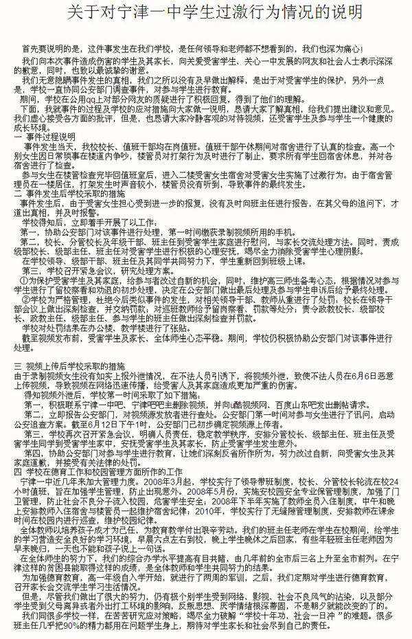 13日下午,宁津一中在网络公开发布《关于对宁津一中学生过激行为情况的说明》,以校方的名义描述了暴力事件的前后经过和处理进展情况。说明写到:“我们无意隐瞒事件发生的真相,我们之所以没有及早做出解释,是出于对受害学生的保护”。