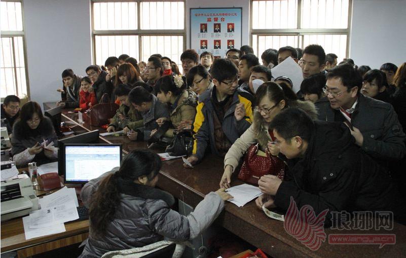 12日,在兰山区民政局婚姻登记处,新人扎堆办结婚证。