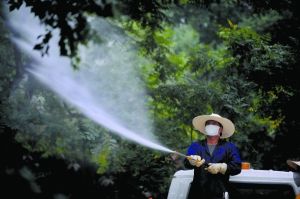 昨日,回龙观龙泽苑西区,工人对树木喷药。昌平区疾控中心昨日确认,龙泽苑西区出现蜱虫,一名居民和多只宠物狗被叮咬。回龙观地区已展开排查、监控和消杀工作。据悉,被叮咬者没有发病。本报记者 杨杰 摄