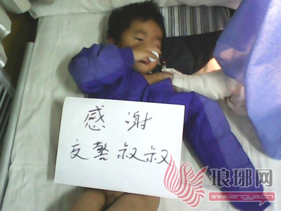 在山东省立医院医院,手术成功的涛涛躺在病床上,家人写下“感谢交警叔叔”的卡片,通过沂蒙晚报向交警们表示感谢。