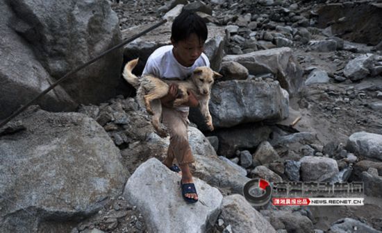 6月11日,15岁的毛罗健紧紧抱着自己的小黄狗走在已成废墟的家中。泥石流在一夜之间,带走了他的爷爷奶奶和父母等亲人,只剩下他一人。