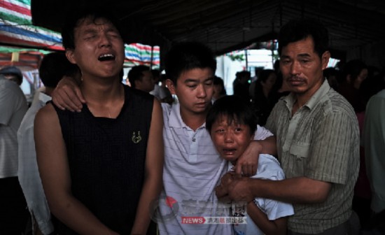 6月10日,毛罗健在詹桥镇老镇政府前坪看到了父母的遗体。他们像往常那样躺在一起,只是隔着冰冷的冰棺玻璃。随后又看到了从小带他长大的爷爷奶奶遗体,强忍着的毛罗健痛哭起来。