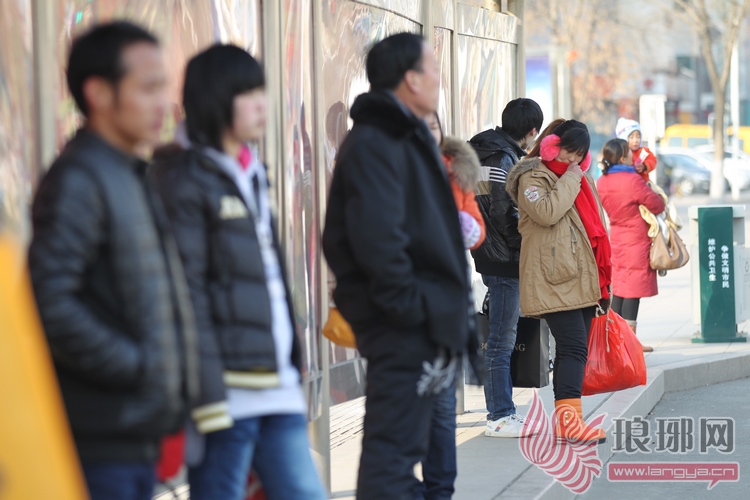 3日下午3点多钟,在沂蒙路与解放路交会处附近的一个公交站台上,许多乘客在寒风中等待着公交车的到来,节日的公交站台上,市民比往常多了不少。