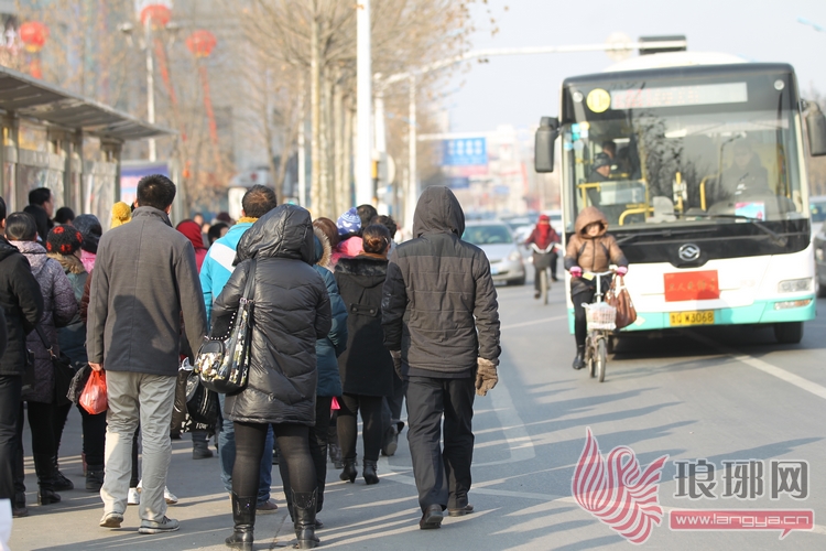 由于太阳偏西,站台处于背阴处很寒冷,许多市民为了取暖,挤到了马路边上,边晒太阳边等车。