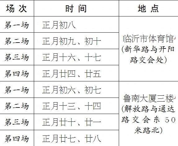 招聘会第一会场在临沂市体育馆(新华路与开阳路交会处),第一场(知名企业专场):农历正月初八(2月17日);第二场:农历正月初九、初十(2月18、19日);第三场:农历正月十六、十七(2月25、26日);第四场:农历正月廿四、廿五(3月5、6日)。