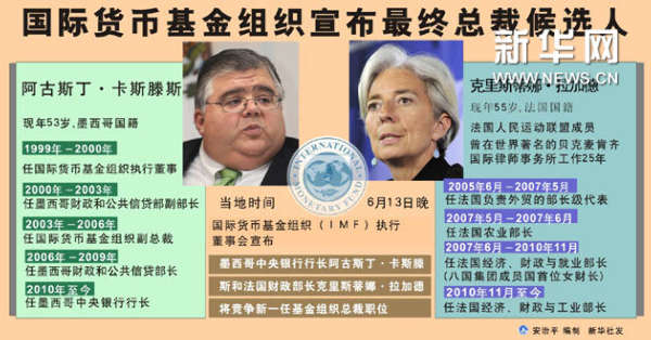 国际货币基金组织(IMF)执行董事会13日晚宣布,这一机构总裁职位的两名最终竞争者是法国财政部长克里斯蒂娜·拉加德和墨西哥中央银行行长阿古斯丁·卡斯滕斯。
