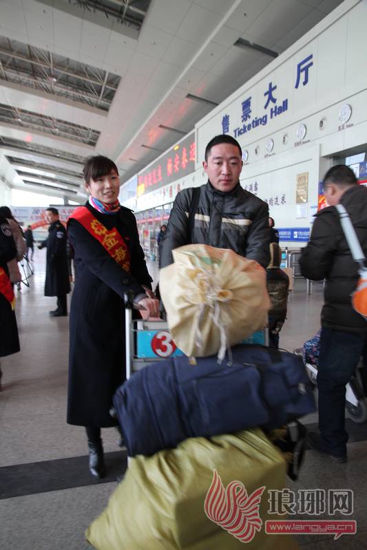 临沂市汽车客运总站“金海棠”服务队在帮助乘客运送行李