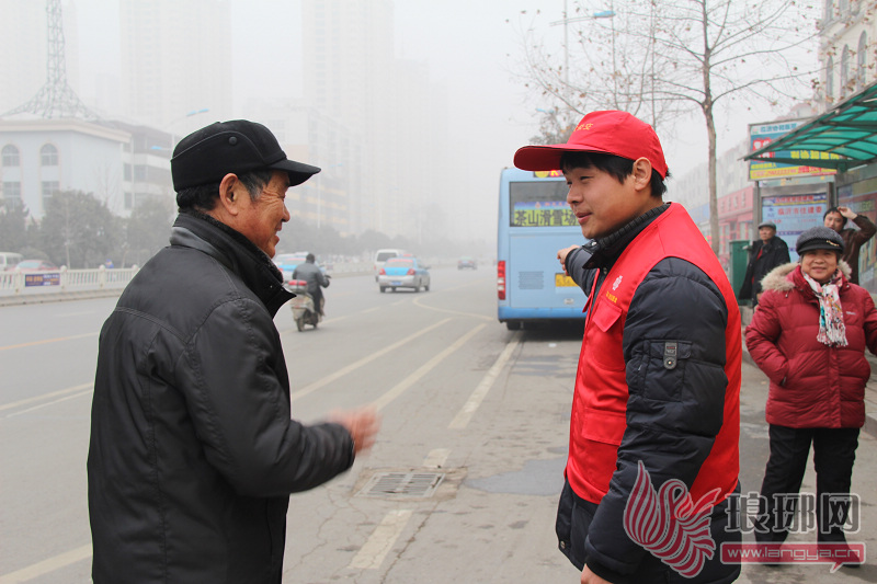 疏导员正给乘客理解雾大请耐心等候公交车