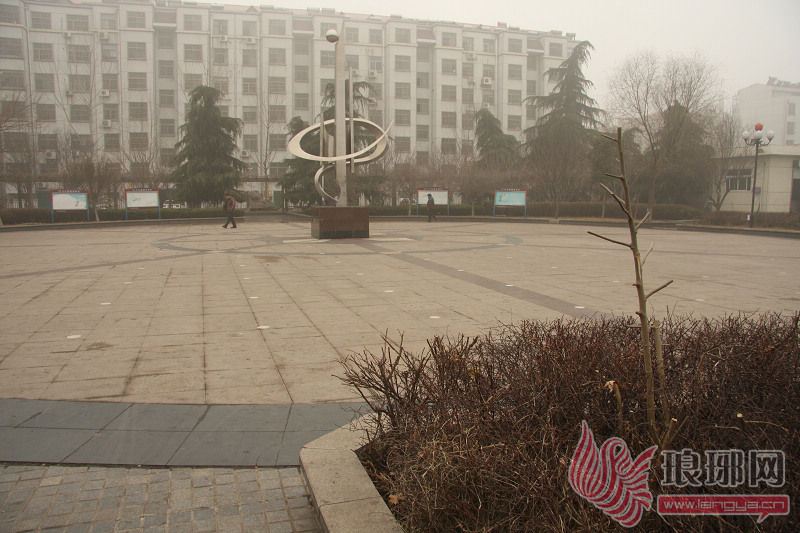 雾霾下的社区广场,只有两名市民在慢走