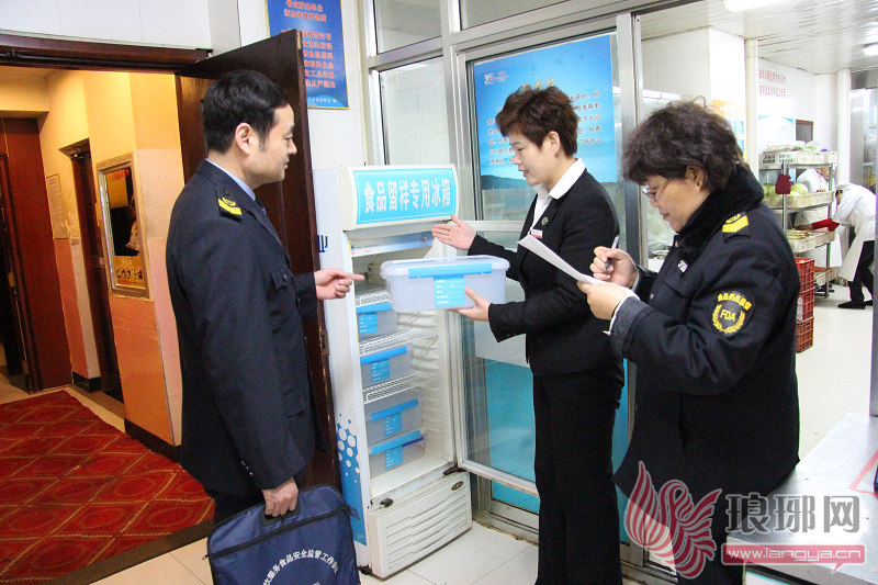 检察人员在查看食品留样冰箱使用情况,食品留样有助于顾客用餐万一出现问题,进行相关检测