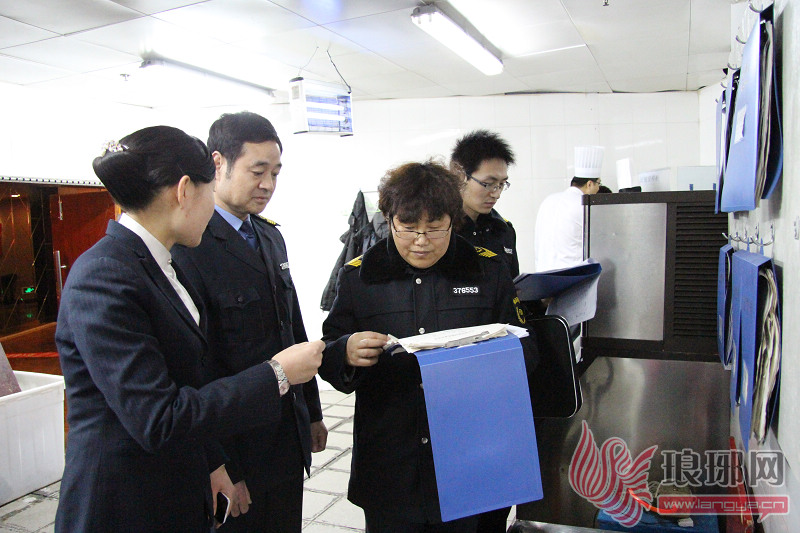 第二站,检查人员来到了蓝海国际大饭店,一行人直接跟随饭店相关负责人,进入后厨,厨房门外的墙上有八个蓝色文件夹非常醒目:“紫外线消毒记录”、“团餐留样记录”、“菜单留样记录”、“凉菜基础质量”、“面点基础质量”等,每个文件夹上都有相关责任人和检查人的姓名。