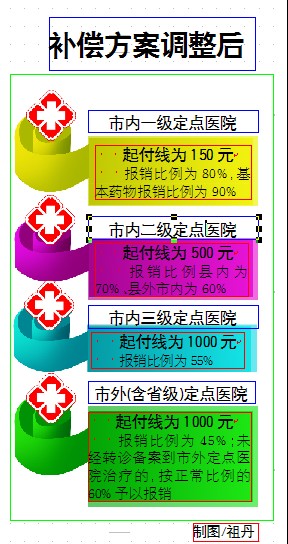 根据方案,一级定点医疗机构住院报销比例为80%,实施基本药物制度的定点医疗机构基本药物报销比例为90%;二级定点医疗机构住院报销比例县内为70%、县外市内为60%;三级定点医疗机构住院报销比例为55%;市外(含省级)定点医疗机构住院报销比例为45%。未经转诊备案(急诊住院除外)到市外定点医疗机构住院治疗的,按正常比例的60%予以报销。