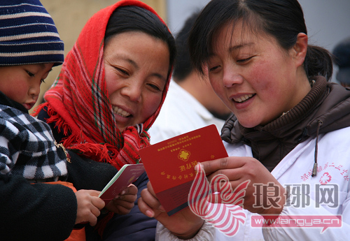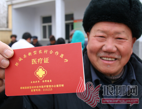1月3日,山东省郯城县郯城镇富强村农民王永健正在展示刚领到的新农合“一卡通”。