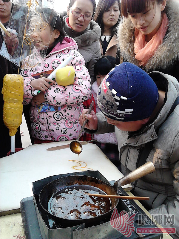 大年初二的年集上有套圈的、卖甘蔗的,每个小摊都充满了浓郁的年味,来往的市民穿梭在各个小摊逛得不亦乐乎,于生涛那个小小的摊位也被人们围得水泄不通。他的摊位是一张小桌子,桌子上摆着一个电磁炉,炉子上的小锅里正在熬煮着浓稠的糖浆。虽然已经是下午3点多了,他手里的活还是闲不下来。
