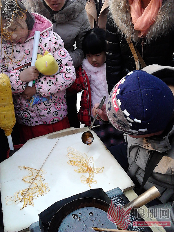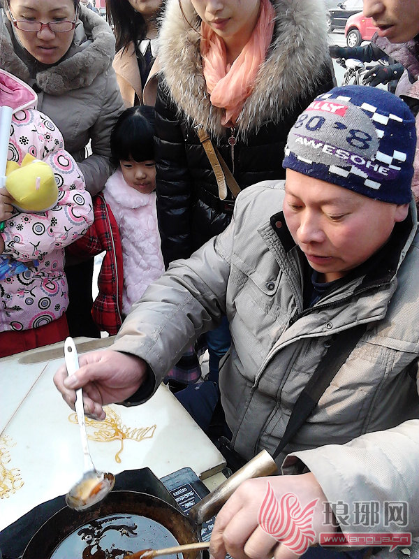 “我家人有好几个属相,那就一样来一个吧,要一只羊、一只老虎、再来一条龙。”“师傅,我想要只凤凰。”面对顾客的要求,于生涛一边答应着,手里一边不慌不忙地把熬好的糖浆慢慢搅匀,在大理石板上均匀地抹一点油,然后舀起一勺糖浆,趁着糖浆没有凝固,灵活地抖动手腕,把糖浆洒在大理石板上,一会功夫,一只惟妙惟肖的龙就出现在大理石板上。