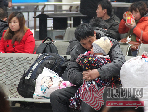 等车之余,齐先生在候车大厅里逗自己的小孙子玩