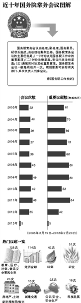 新京报讯 (记者王姝 邢世伟 邓琦)20日,国务院总理温家宝主持召开本届政府第234次国务院常务会议。据新华社消息,从2008年3月19日以来,国务院常务会议共研究讨论611个议题。记者粗略统计十年数据发现,两届政府共召开国务院常务会议400余次,内容涉及民生、环保、公共安全等近20个方面。梳理各年的议题内容,折射出政府的施政重点,同时展现出中国十年来经济社会发展轨迹。