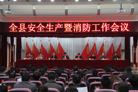 2月23日上午,县政府召开全县安全生产暨消防工作会议,主要是贯彻落实党的十八大和省、市安全生产电视会议精神,安排部署2013年工作任务。县政府对安全生产工作成绩突出的单位和个人进行表彰奖励,分别与乡镇(街道、开发区)、县直部门代表签订了2013年安全生产目标责任书。会议由县委常委、常务副县长张云超主持,县政府领导班子全体成员,各乡镇长,界湖街道办事处主任,沂南经济开发区管委会主任,各乡镇安监办主任,县直各部门主要负责人,县安委会各专业委员会联络员,全县43家重点企业和县安监局全体人员参加了会议。县委副书记、县长鞠艳峰作了重要讲话。