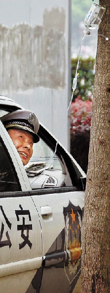 6月13日上午9时许,在武汉市青山友谊大道三弓路路口,一辆编号为8615的警车停在路边,小树上悬挂着吊瓶,长长的输液管拖下来,延伸到一旁的车窗内,一名交警正坐在警车内输液。