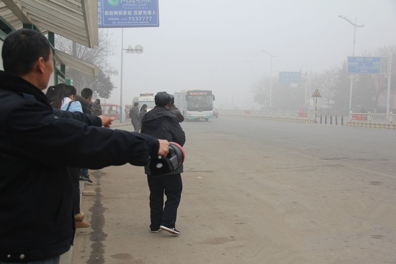 27日上午,雾霾笼罩临沂,部分路段能见度仅30米,严重影响驾驶员的视线。为此,临沂市公交总公司安排人员在河东区部分站点用手电筒灯光引导车辆进站。