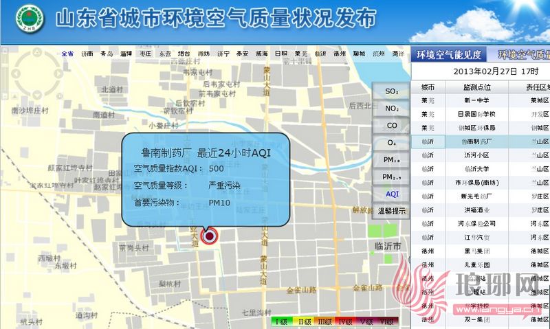 下午5时,鲁南制药厂监测点位监测的数据,AQI为500,已经爆表