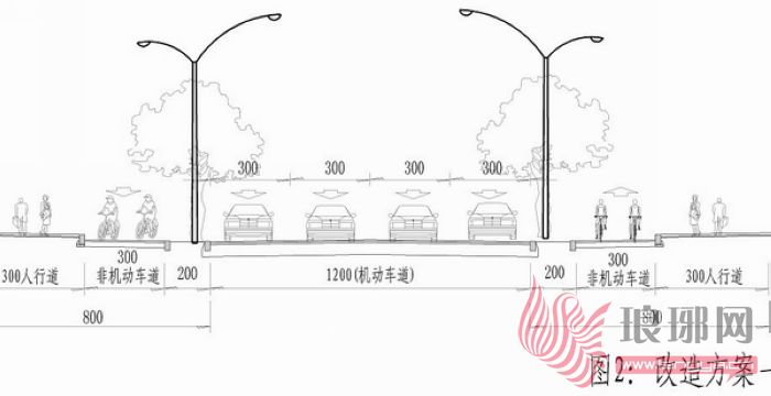 据了解,该路段规划红线宽30米,主车道12米,两侧人行道宽度各为5米。人行道外侧至两边建筑的距离为0~15米不等,均以人行道板铺装。主车道中间设两条3.5米的机动车单行道,两侧各为2.5米的非机动车道。目前该道路存在道路宽度尤其是机动车宽度不够、机动车通行能力不足、机动车与非机动车混行等问题。