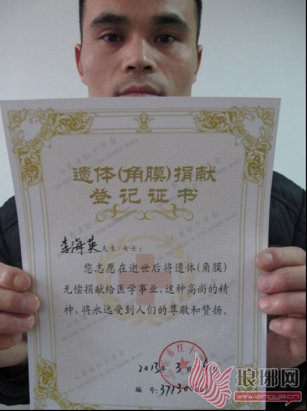 6日中午,记者陪同李海英的丈夫刘水亮一同来到了临沂市红十字会,在审核完李海英的遗体(角膜)捐献登记表后,临沂市红十字会业务二部部长周连通帮助李海英完成了遗体(角膜)捐献登记证书的填写,并郑重地加盖了临沂市红十字的公章。“这是今年我市第一个签署角膜捐献的志愿者,也是自2006年临沂市红十字会建会以来第二个志愿在死后捐献角膜的市民,我们对她表示由衷的尊敬。”