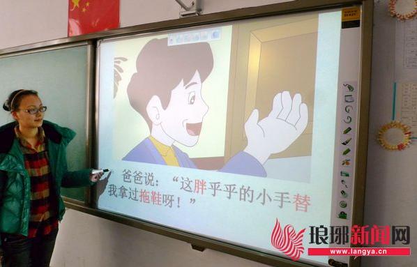 13日,就在张娜给学生们上课的时候,临沭县最北的乡镇青云镇中心小学一年级二班教室里,王潇然老师正在给学生们上着同样的课,虽然和张娜相比,王潇然的课件不够精美,但这种新颖的上课方式还是让孩子们感觉到很新鲜,“孩子们都觉得现在的课比去年的课要生动。”王潇然告诉记者。