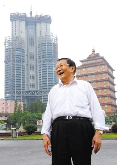 2009年8月12日,吴仁宝在华西村幸福园与村民交谈。他的身后是当时正在建设的“华西增地空中新农村大楼”。 新华社记者 孙参 摄