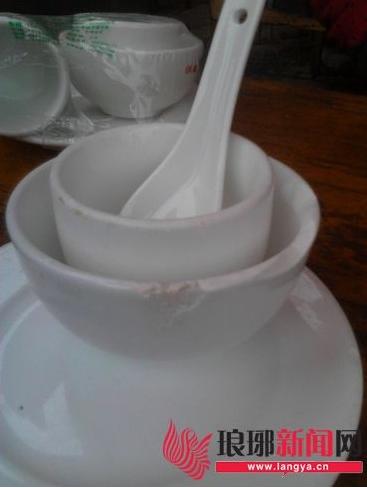 在启阳路一家小餐馆内,记者查看了放在桌子上的几套餐具,发现每套餐具都有破损或者缺口,有的是杯沿上有豁口,有的是盘子边沿碰掉一块,放在桌子上非常不雅观。
