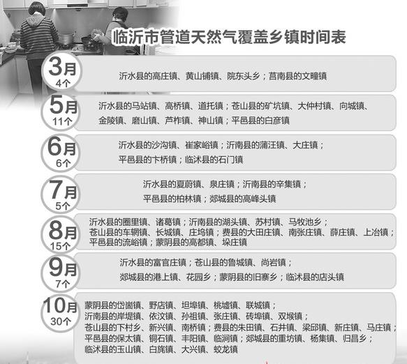 临沂市住建委细化任务完成节点,将全市78个未实现管道天然气覆盖的乡镇工作任务细化分解到每个月份,其中,三月份通气乡镇4个,五月份11个,六月份为沂水县沙沟镇6个,七月份5个,八月份15个,九月份7个,十月份30个,确保工程在10月底前全面完工,实现2013年镇镇通天然气,让更多的农村居民用上安全清洁的能源。